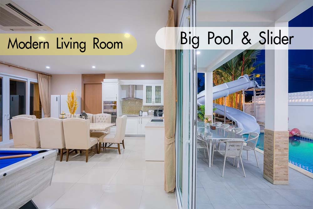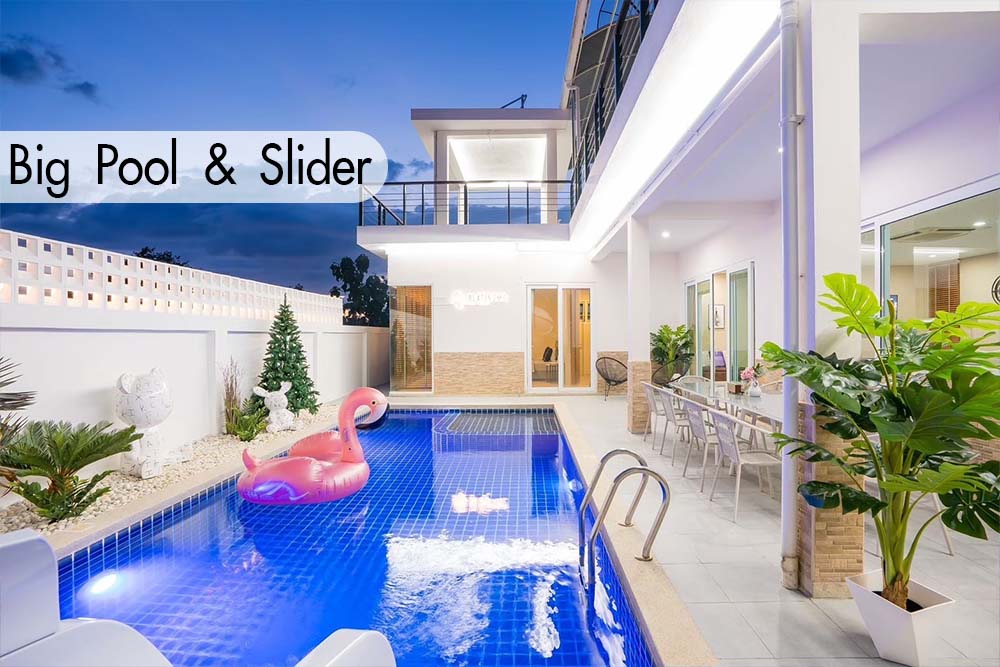 Ptniam พูลวิลล่า&คาราโอเกะ (6 ห้องนอน / 5 ห้องน้ำ) พูลวิลล่าขนาดใหญ่ มีสระเด็ก สไตล์โมเดิร์น พูลวิลล่าที่ใกล้แหล่งท่องเที่ยวทั้งในพัทยาและสัตหีบ เหมาะสำหรับการพักผ่อนแบบครอบครัว ปาร์ตี้สังสรรค์ ตกแต่งด้วยโทนสีสบายตา มีมุมสบายถ่ายรูปอวดเพื่อน ๆ จะเซลฟี่มุมไหนก็ดูชิค กับบรรยากาศชิว ๆ ใกล้ทะเลหลายที่ขับรถเพียง 10-15 นาที ก็ถึงทะเลสวย ๆ ใกล้บ้าน ที่พักในเขตนาจอมเทียน อ.สัตหีบ มีสระว่ายน้ำ แบบโมเดิร์นสไตล์ ใกล้ สวนน้ำโคลัมเบีย พิคเจอร์ส อควาเวิร์ส , สวนน้ำรามายณะ (ramayana water park) , สวนนงนุชพัทยา ท่านสามารถไปเที่ยว หาดทรายแก้ว หรือ หาดบางเสร่ ได้โดยสะดวกจากที่พักได้ในเวลาเพียง 10-15 นาที นอกจากนี้ท่านยังสามารถไปนมัสการ พระพุทธรูปแกะสลักหน้าผาเขาชีจรรย์ หรือที่ยว ฟาร์มแกะ Swiss Sheep Farm ได้โดยสะดวกจากที่พักในระยะเวลาเพียง 5 - 10 นาทีได้อย่างสะดวกสบาย
