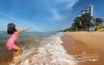 เด็ก ๆ สามารถเล่นน้ำทะเลที่หาดบางเสร่ได้ เพราะไม่ลึก และไม่ลาดชันมาก