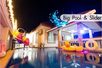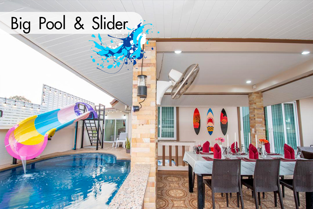 ที่พักสัตหีบ : บ้านพักแบบพูลวิลล่าบางเสร่ สัตหีบ (Bangsaray Poolvilla Near Beach)พร้อมสไลเดอร์ ห่างทะเลเพียงแค่ 200 - 300 เมตร ใกล้กับ หาดบางเสร่ซึ่งเป็นหาดสวยงาม เล่นน้ำทะเลได้ ทรายละเอียด คลื่นไม่แรง บริเวณชายหาดมีบริการเรือกล้วยบานาน่าโบ๊ท (Banana Boat) หรือจะพาเพื่อน ๆ มานั่งชิล ๆ ริมทะเลตอนกลางคืนได้